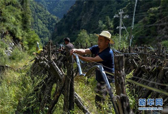 8月10日,四川壤塘縣下大石溝村黨支部書記索更(右一)帶領村民為村集體的青杠木耳種植示范基地更換噴淋水管。新華社記者 張超群 攝.