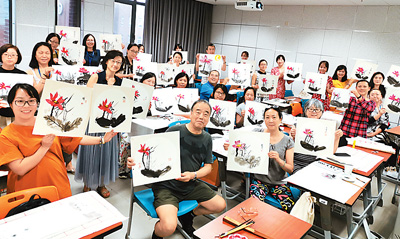 圖為教師們在展示國畫作品。北京外國語大學供圖