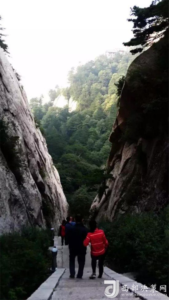 千尺幢往上看為一線天,往下望如深井,它形如裂隙,四壁直立,鑿石為梯,被稱為“太華咽喉”,共有370個(gè)臺(tái)階,坡度為70度,是華山著名險(xiǎn)道之一。