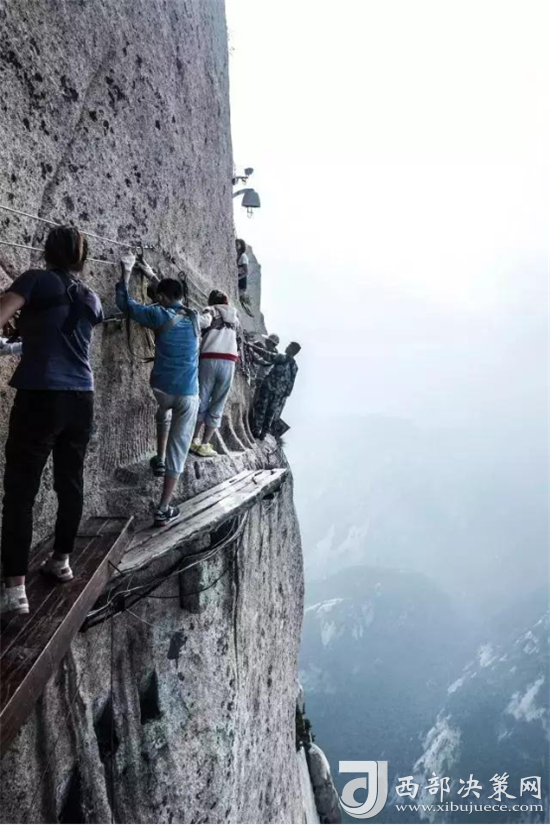 長(zhǎng)空棧道位于華山南峰東側(cè)山腰,是華山派第一代宗師元代高道賀志真為遠(yuǎn)離塵世靜修成仙,在萬(wàn)仞絕壁上鑲嵌石釘搭木椽而筑。長(zhǎng)空棧道的盡頭便是思過(guò)崖。