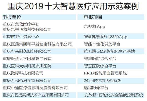 8月28日,在2019智博會上,重慶日報、上游新聞聯(lián)合發(fā)布了重慶2019十大智慧醫(yī)療應(yīng)用示范案例,重慶市急救醫(yī)療中心、重慶市衛(wèi)生信息中心、重慶華森制藥等單位申報項目入選十大案例。