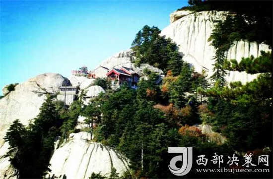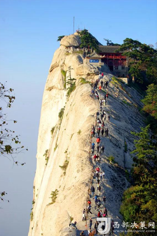 又因峰巔有巨石形狀好似蓮花瓣,古代文人多稱其為蓮花峰、芙蓉峰。西峰為一塊完整巨石,渾然天成。西北絕崖千丈,似刀削鋸截,其陡峭巍峨、陽剛挺拔之勢是華山山形之代表,因此古人常把華山叫蓮花山。西峰南崖有山脊與南峰相連,脊長300余米,石色蒼黛,形態(tài)好像一條屈縮的巨龍,人稱為屈嶺,也稱小蒼龍嶺,是華山著名的險道之一。