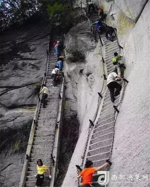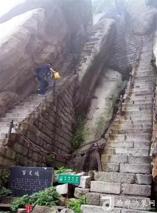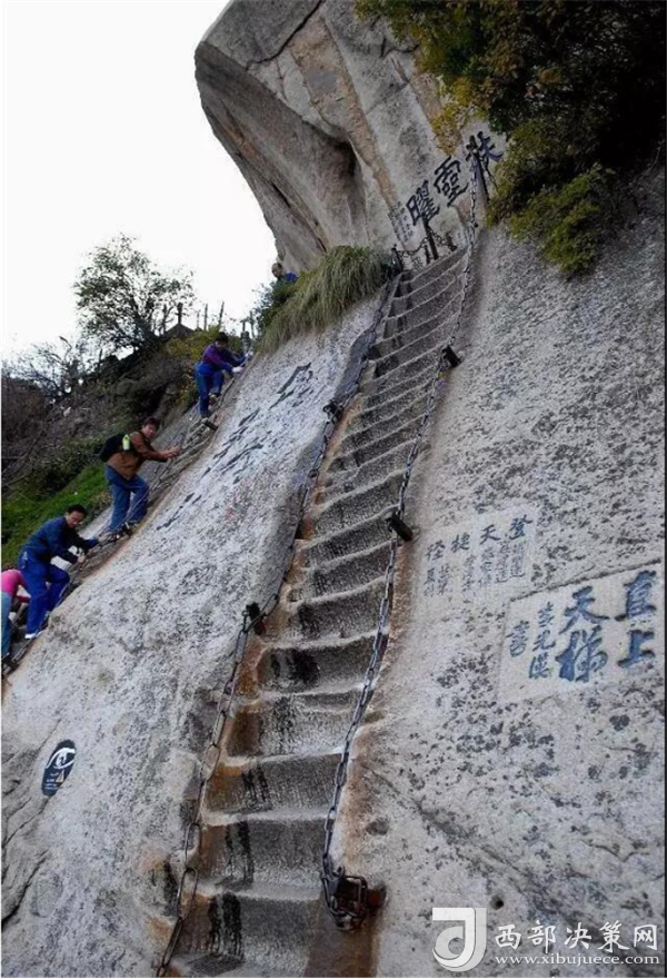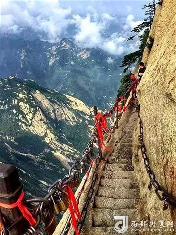 眾所周知,華山在五岳之中以“險峻”著稱。素有“奇險天下第一山”之譽,華山的主體是由一塊完整碩大的花崗巖體構(gòu)成的,挺拔地屹立在渭河平原。東、南、西三峰拔地而起,如利刃削就。由于華山太險,所以唐代以前很少有人登臨,歷代君王祭祀西岳,也只是在山下西岳廟中舉行大典。據(jù)記載,直到魏晉南北朝時期,還沒有通向華山峰頂?shù)牡缆?。唐代才逐漸在北坡沿溪谷而上開鑿了一條險道,也從此有了“自古華山一條路”的說法。