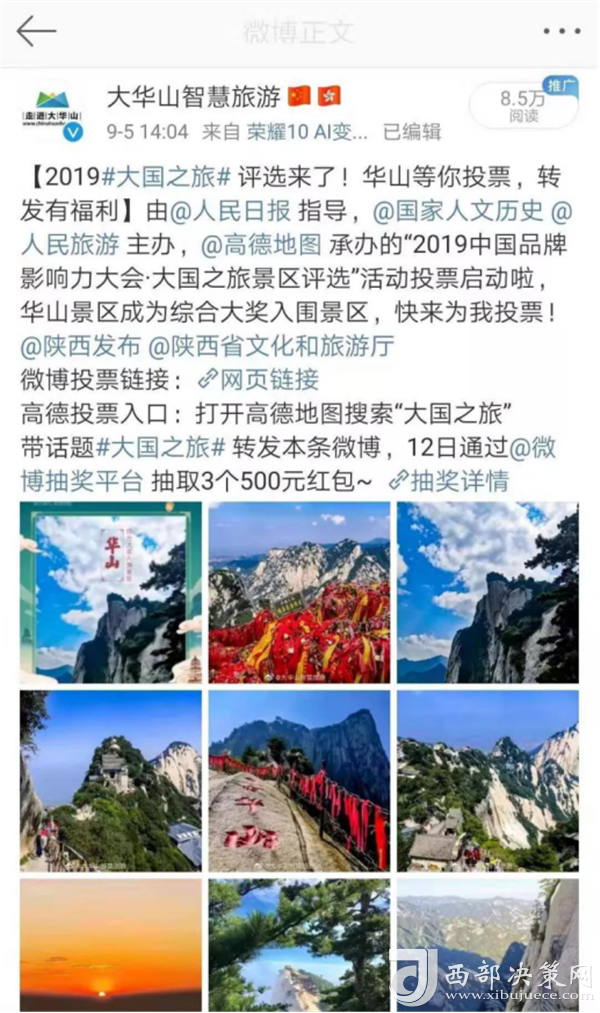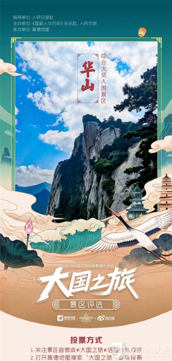 2019大國之旅景區(qū)評(píng)選活動(dòng)由人民日?qǐng)?bào)社指導(dǎo),《國家歷史人文》雜志社、人民旅游主辦,高德地圖承辦,于9月2日正式啟動(dòng)。此次活動(dòng)采取大眾投票+高德地圖旅游大數(shù)據(jù)+專家及媒體評(píng)審相結(jié)合的形式,得出最終獲獎(jiǎng)名單。游客通過新浪微博關(guān)注景區(qū)官博“ 大華山智慧旅游”為華山景區(qū)投票,智旅公司協(xié)助高德地圖完善了華山景區(qū)地圖板塊的校準(zhǔn)和更新,此次活動(dòng)的開展,華山景區(qū)的品牌影響力和知名度也再次得到提升。