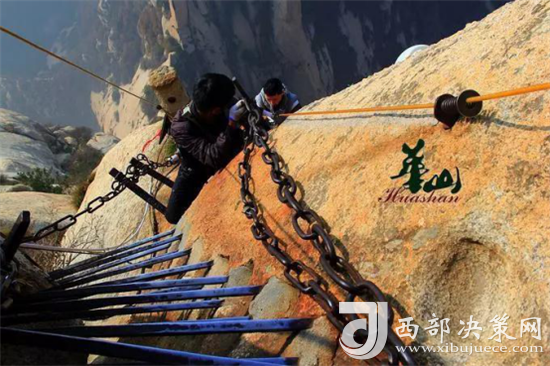 長(zhǎng)空棧道位于華山南峰東側(cè)山腰,是華山派第一代宗師元代高道賀志真為遠(yuǎn)離塵世靜修成仙,在萬(wàn)仞絕壁上鑲嵌石釘搭木椽而筑。棧道上下皆是懸崖絕壁,鐵索橫懸,由條石搭成尺許路面,下由石柱固定,游人至此,面壁貼腹,屏氣挪步,被譽(yù)為“華山第一天險(xiǎn)”。由于棧道險(xiǎn)峻,故當(dāng)?shù)厝擞?ldquo;小心九厘三分,要尋尸首,洛南商州”之說(shuō)。這里只是探險(xiǎn)之道,并非登山必由之路,膽小人就在升表臺(tái)看看也就行了。所以石刻上不少警告之語(yǔ):“懸崖勒馬”等。(供稿:華旅集團(tuán)營(yíng)銷中心)