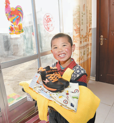 互助縣班彥新村的兒童在剛遷入的新居內(nèi)展示新買(mǎi)的衣服。攝于2017年1月。新華社記者 吳 剛攝