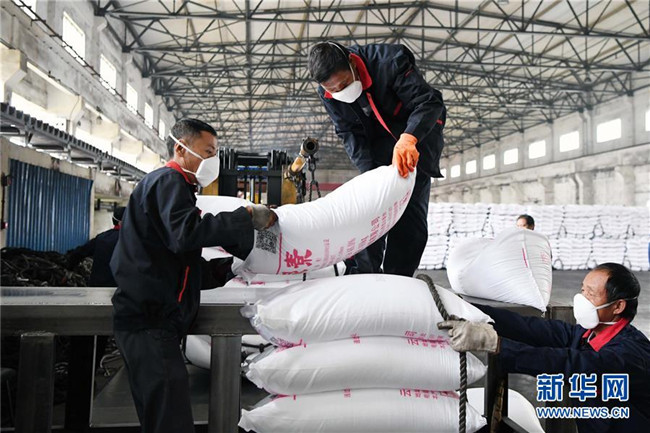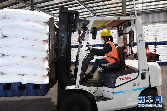 10月14日,轉(zhuǎn)移就業(yè)的農(nóng)民在云南省曲靖市沾益區(qū)花山街道勞務中心尿素包裝裝卸車間工作。