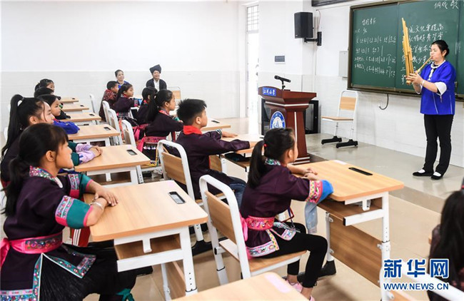 這是廣西三江侗族自治縣民間藝人在教江川小學(xué)學(xué)生吹奏蘆笙(10月14日攝)。新華社記者張愛林攝