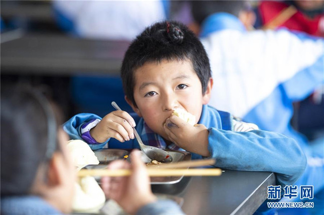 在西吉縣田坪鄉(xiāng)中心小學,學生在享用免費營養(yǎng)午餐(10月23日攝)。