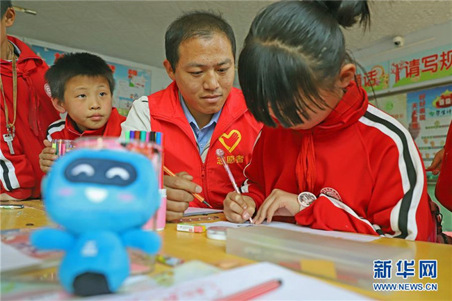 11月4日,支教志愿者在輔導學生畫畫。新華社記者 金良快 攝