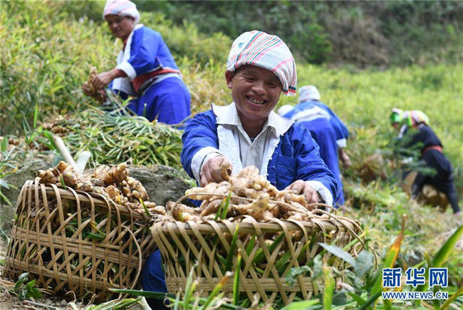 11月12日,廣西賀州市平桂區(qū)鵝塘鎮(zhèn)槽碓村的土瑤群眾在收獲大肉姜。