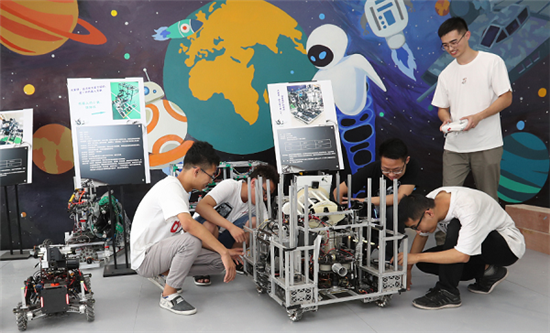 四川大學(xué)智能感知與先進控制創(chuàng)新工坊中,團隊帶頭人吳文強正在為同學(xué)們演示操作工程車機器人。 張勁松攝