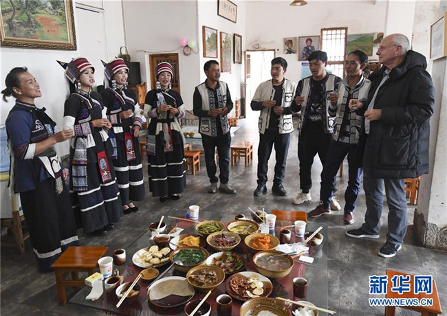 11月28日,大糯黑村村民畢興學(xué)(左五)、李學(xué)芝(左一)夫婦和工作人員們一起給外國游客(右一)祝酒。李學(xué)芝和丈夫畢興學(xué)經(jīng)營著一家農(nóng)家樂,生意紅火。新華社記者王全超攝