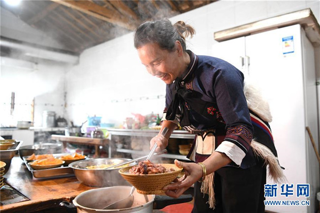 11月28日,42歲的大糯黑村村民李學(xué)芝在廚房內(nèi)為游客準(zhǔn)備午餐。李學(xué)芝和丈夫畢興學(xué)經(jīng)營著一家農(nóng)家樂,生意紅火。新華社記者周華攝