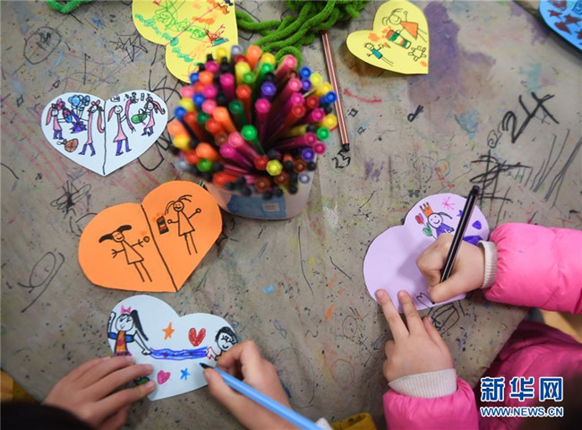 12月11日,小朋友們?cè)诶L制愛(ài)心卡片,準(zhǔn)備跟愛(ài)心圍巾一起寄給西藏的小朋友們。 新華社記者 徐昱 攝