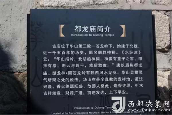 廟始建時(shí)稱胡趨神寺?!端?jīng)注》記述:“化山搦嶺,北胡趨寺,神像有童子之容。祠祀有感,則云與之平,然后敢度”。清以后,廟被俗稱為都龍廟,又作督龍廟,廟內(nèi)塑像為龍君,怒目圓睜,須髭飄冉,形象生動(dòng)威武。廟的更名大凡與清乾隆時(shí)陜西巡撫畢沅開鑿蒼龍嶺道路、傷了龍脈的傳說有關(guān)。據(jù)民間傳,自畢沅開路傷龍脈后,蒼龍?jiān)贌o力行云布雨以護(hù)農(nóng)桑,百姓便塑像祭奉香火以示懺悔,祈請(qǐng)并督促蒼龍病體康復(fù),佑百姓豐年太平。(供稿:華旅集團(tuán)營(yíng)銷中心)