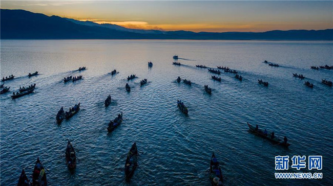 當(dāng)日,位于云南省玉溪市江川區(qū)的星云湖迎來(lái)一年一度的開(kāi)湖捕魚(yú)季,600余艘漁船駛?cè)胄窃坪稉啤?星云湖是云南省九大高原湖泊之一,本次開(kāi)湖捕魚(yú)時(shí)間將從2019年12月25日持續(xù)至2020年1月23日。 新華社記者 胡超 攝