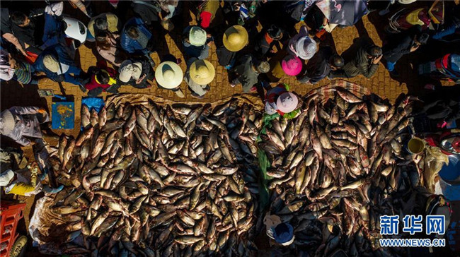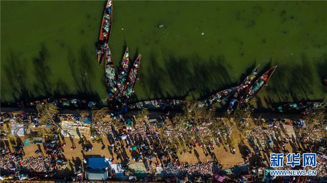 星云湖畔的老河咀魚(yú)市熱鬧非凡(12月25日無(wú)人機(jī)拍攝)。新華社記者 胡超 攝