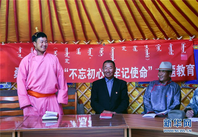 2019年10月11日,在內(nèi)蒙古自治區(qū)正藍(lán)旗恩克寶力格嘎查黨員中心戶(hù)的蒙古包中,黨員敖日格勒(左一)在回答知識(shí)競(jìng)賽問(wèn)題。新華社記者 劉磊 攝