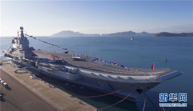 2019年12月17日,我國第一艘國產(chǎn)航空母艦山東艦在海南三亞某軍港交付海軍。經(jīng)中央軍委批準(zhǔn),我國第一艘國產(chǎn)航母命名為“中國人民解放軍海軍山東艦”,舷號(hào)為“17”。這是2019年12月15日拍攝的??吭诤D先齺喣耻姼鄣纳綎|艦(無人機(jī)照片)。 新華社記者 李剛 攝