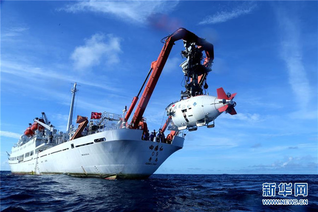 在西太平洋海域,“蛟龍”號(hào)載人潛水器離開“向陽紅09”科學(xué)考察船準(zhǔn)備進(jìn)入水中,進(jìn)行中國大洋38航次最后一潛(2017年6月13日攝)。 新華社記者 劉詩平 攝