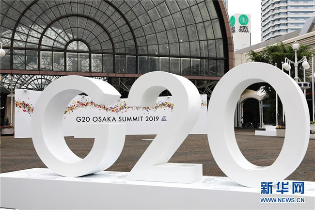 這是2019年6月27日在日本大阪拍攝的G20大阪峰會新聞中心入口處的標(biāo)志。 新華社記者 杜瀟逸 攝