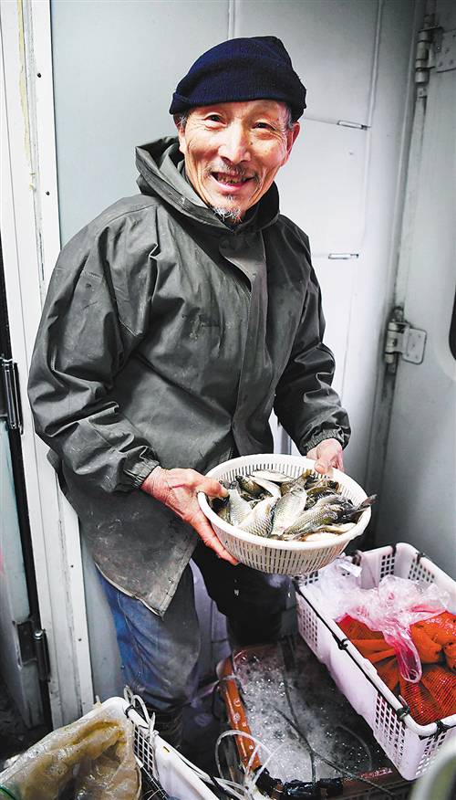 懷化至梅江的7272次列車車廂里,80歲的符長(zhǎng)理老人帶著剛剛捕撈的魚蝦,乘車前往貴州省銅仁市菜市場(chǎng)銷售。