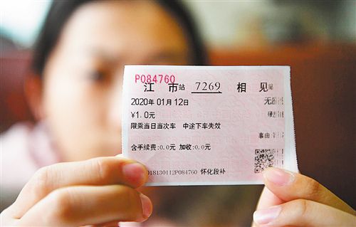 ▲江市站開往相見站的7269次列車上,一名旅客展示自己的車票,票價(jià)只有1元。列車最高票價(jià)11元。
