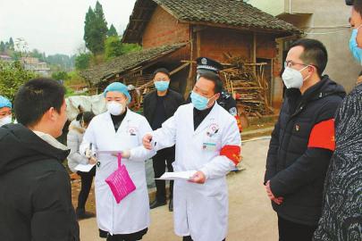 1月30日,在內(nèi)江市東興區(qū)白合鎮(zhèn)龍沖村,該鎮(zhèn)防控新型冠狀病毒感染肺炎疫情黨員先鋒隊(duì)隊(duì)員上門(mén)為群眾服務(wù),筑牢聯(lián)防聯(lián)控基礎(chǔ)。 李建明攝