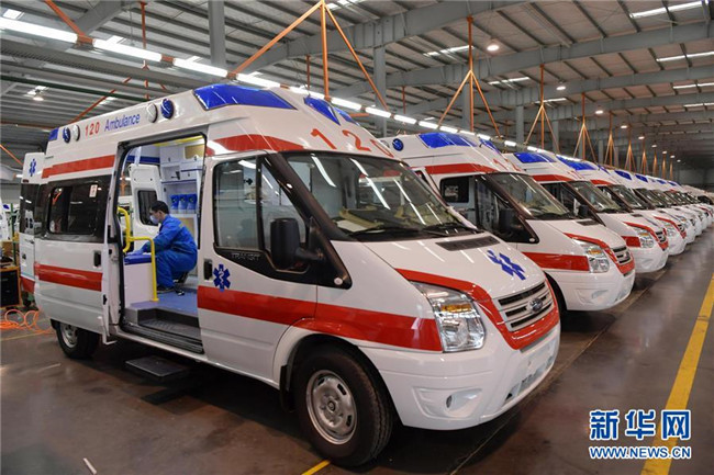 在江西江鈴汽車集團改裝車股份有限公司負壓救護車生產(chǎn)基地內(nèi),工作人員在負壓救護車生產(chǎn)線上進行裝配調(diào)試(2月6日攝)。 新華社記者 彭昭之 攝