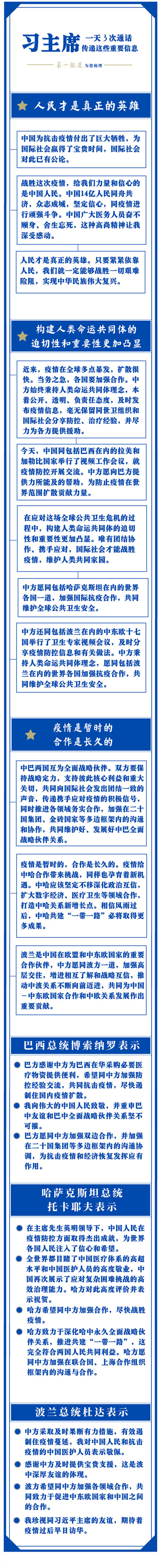 頻密互動(dòng),高效溝通。習(xí)主席通話內(nèi)容信息量很大:介紹中國抗疫努力,深化國際抗疫合作,推動(dòng)雙邊關(guān)系發(fā)展……其中,“合作”與“人類命運(yùn)共同體”是習(xí)主席反復(fù)提到的關(guān)鍵詞。