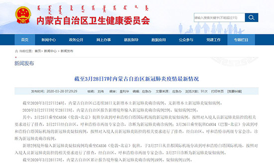 3月28日,記者從內(nèi)蒙古自治區(qū)衛(wèi)生健康委員會(huì)獲悉,截至2020年3月27日24時(shí),內(nèi)蒙古自治區(qū)已連續(xù)38日無(wú)新增本土新冠肺炎確診病例、無(wú)新增本土新冠肺炎疑似病例。