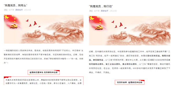 2月20日,經(jīng)開區(qū)通過微信公眾號、新浪微博策劃制作《我是黨員,我?guī)ь^》《我是黨員,我行動》系列網(wǎng)絡(luò)稿件,刊播下沉社區(qū)一線的黨員干部事跡10期,以小見大,充分展現(xiàn)基層黨組織和黨員干部勇當先鋒、敢打先陣的帶頭作用。