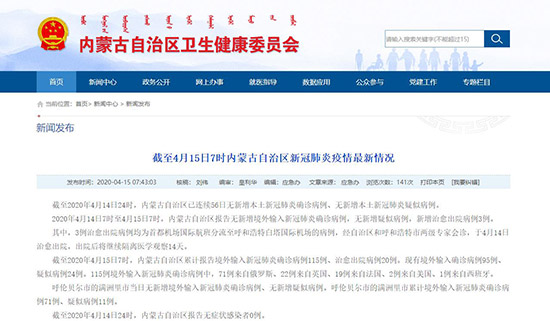 2020年4月14日7時至4月15日7時,內(nèi)蒙古自治區(qū)報告無新增境外輸入新冠肺炎確診病例,無新增疑似病例,新增治愈出院病例3例。