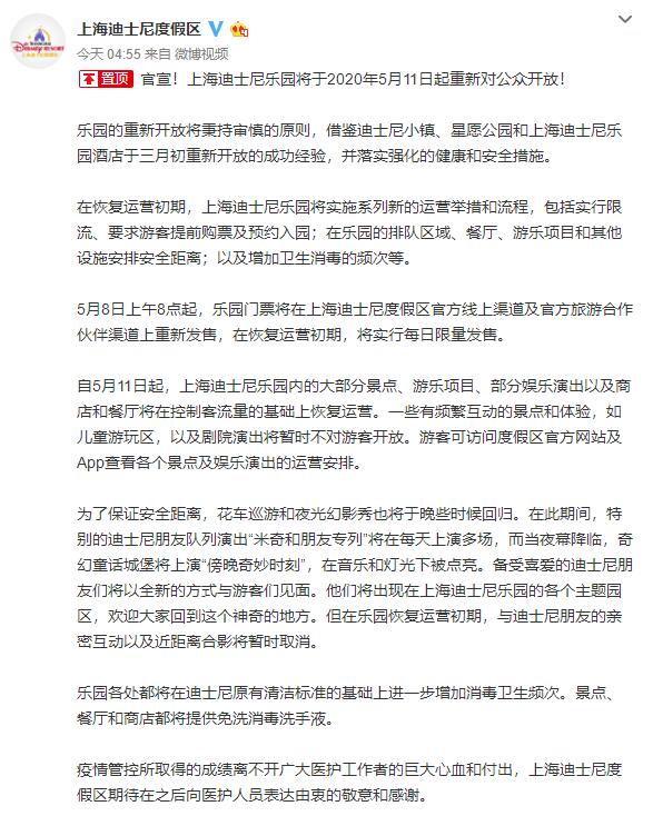 據(jù)上海迪士尼度假區(qū)官方微博消息,上海迪士尼樂園將于2020年5月11日起重新對公眾開放。在恢復(fù)運營初期,上海迪士尼樂園將實施系列新的運營舉措和流程,包括實行限流、要求游客提前購票及預(yù)約入園,在樂園的排隊區(qū)域、餐廳、游樂項目和其他設(shè)施安排安全距離,以及增加衛(wèi)生消毒的頻次等。