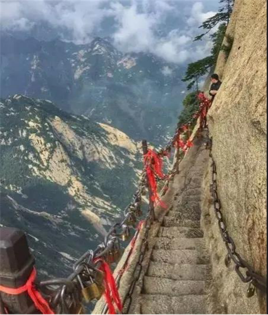 在萬仞絕壁上鑲嵌石釘搭木椽而筑,棧道上下皆是懸崖絕壁,鐵索橫懸,游人至此,面壁貼腹,屏氣挪步,被譽為“華山第一天險”。