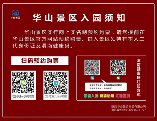 1、華山景區(qū)步行登山道(華山門)于今日(2020年5月15日)正式開放,每日最大限流1000人,運營時間為7:00至15:00。景區(qū)門票預約政策從原來的三天可預約改為七天可預約,開放當日售票,根據(jù)庫存上限,售完即停。