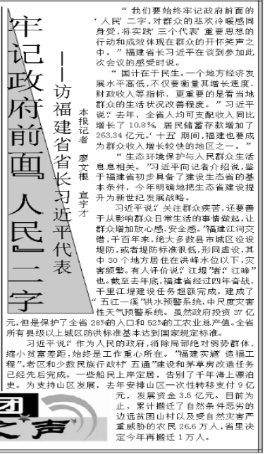 “我們要始終牢記政府前面的‘人民’二字,對(duì)群眾的悲歡冷暖感同身受。”2002年3月4日,人民日?qǐng)?bào)兩會(huì)特刊的“代表團(tuán)之聲”欄目里,刊發(fā)了對(duì)時(shí)任福建省省長(zhǎng)的習(xí)近平代表的采訪,標(biāo)題是《牢記政府前面“人民”二字》。