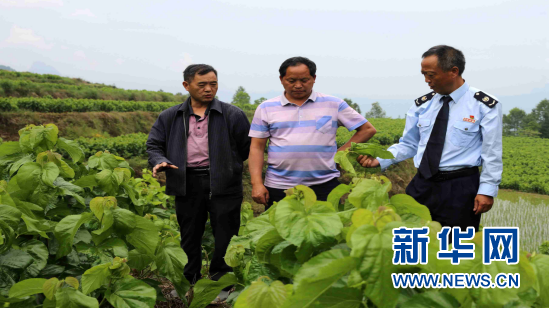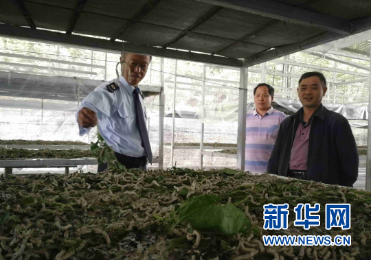 養(yǎng)蠶大戶鄧遂洪(左一)介紹桑樹防蟲技術(shù)。新華網(wǎng)發(fā)(重慶稅務(wù)供圖)