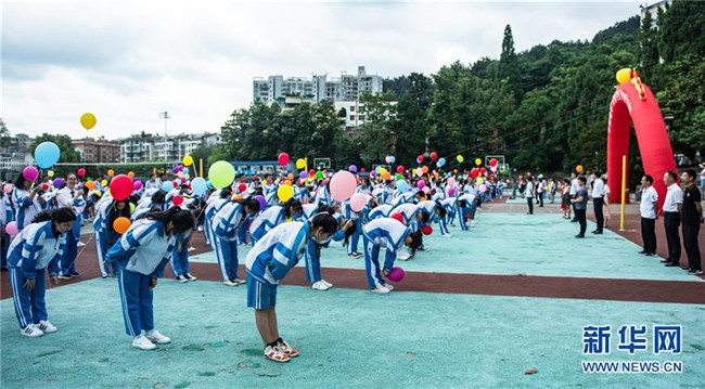 6月27日,烏當(dāng)中學(xué)高三學(xué)生向老師鞠躬表達(dá)感謝。新華社記者 陶亮 攝