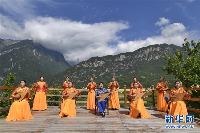 四川省阿壩藏族羌族自治州阿壩縣“蓮寶葉則”演藝公司演職人員在表演傳統(tǒng)曲種《折嘎》(6月14日攝)。折嘎是古老的曲種,如今被搬上舞臺,并在演唱中加入了傳遞吉祥、贊頌新人新事新風(fēng)尚的內(nèi)容。這些演職人員中不少是從當(dāng)?shù)剜l(xiāng)村里來的年輕人,經(jīng)過培訓(xùn)合格后成為演員,通過表演獲得穩(wěn)定的收入。新華社記者 沈伯韓 攝