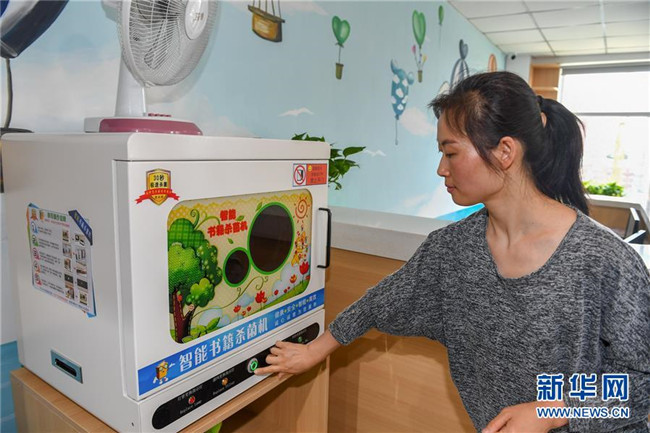 7月2日,在長(zhǎng)春市少年兒童圖書(shū)館平陽(yáng)社區(qū)繪本主題分館,管理員金敏為圖書(shū)進(jìn)行消殺。 新華社記者 張楠 攝