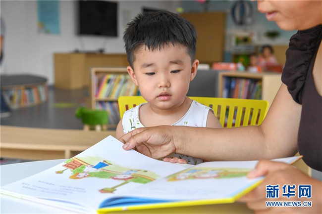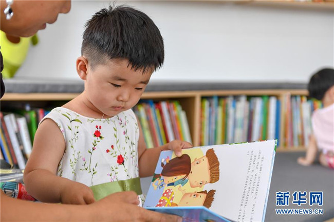7月2日,在長(zhǎng)春市少年兒童圖書(shū)館平陽(yáng)社區(qū)繪本主題分館,家長(zhǎng)為小朋友講故事。新華社記者 張楠 攝