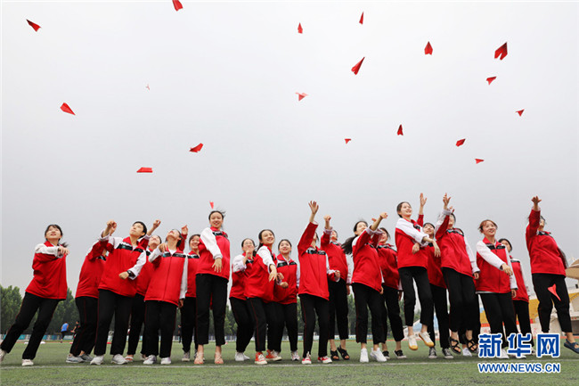 2020年7月3日,河南省溫縣一中高三學(xué)生在學(xué)校操場(chǎng)上做減壓游戲。 2020年全國(guó)高考即將拉開帷幕,同學(xué)們從容應(yīng)對(duì),以良好的狀態(tài)迎接高考的到來。 新華社發(fā)(徐宏星 攝)