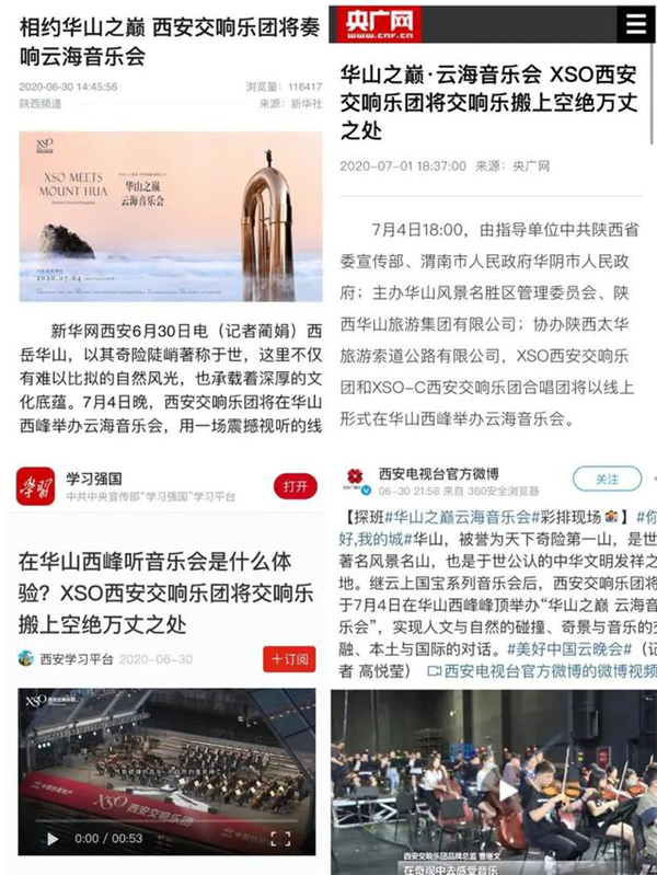 本場(chǎng)華山之巔·云海音樂(lè)會(huì)通過(guò)央視新聞、央視頻、央視音樂(lè)、B站、中新網(wǎng)、人民視頻、愛(ài)奇藝隨刻、愛(ài)滿地古典音樂(lè)頻道、西安發(fā)布、西安臺(tái)、華商網(wǎng)、西部網(wǎng)、咪咕音樂(lè)、焦糖、西影視頻等平臺(tái)進(jìn)行了同步播放。全網(wǎng)首輪播放量5千萬(wàn)+。