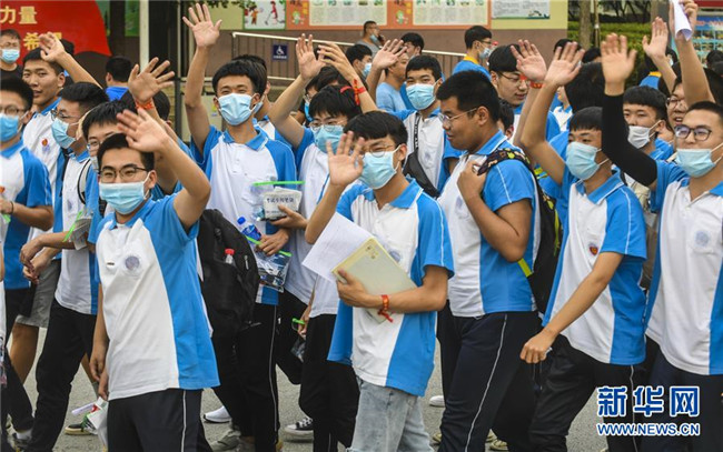 7月8日,在福建省福州教育學院附屬中學考點,考生和同學揮手告別。 當日,全國部分地區(qū)2020年高考結(jié)束。 新華社記者 宋為偉 攝