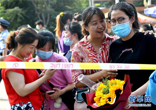 7月8日,吉林省長春希望高中考點的考生接過家長手中的花束。 當日,全國部分地區(qū)2020年高考結(jié)束。 新華社記者 張楠 攝