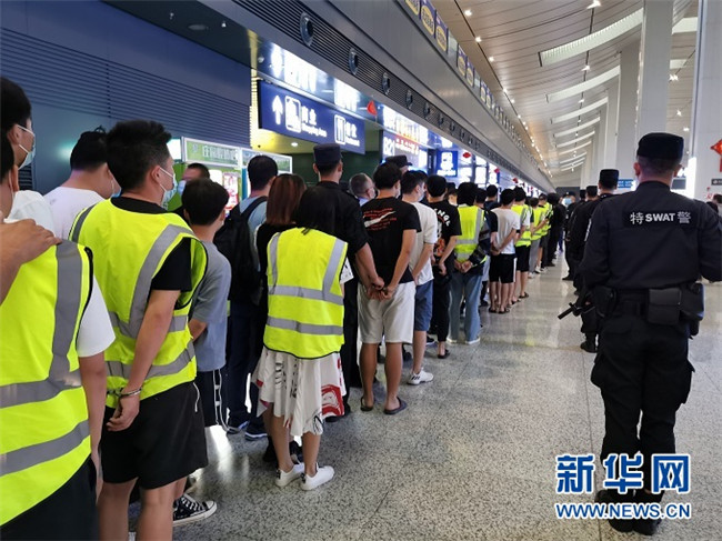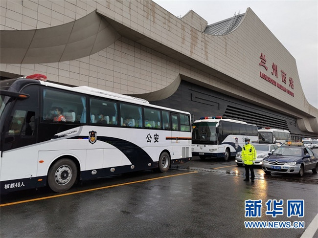 7月11日19時,在位于蘭州市區(qū)的蘭州西站,137名犯罪嫌疑人在警方押解下走下列車,這僅是蘭州警方破獲的一起特大電信網(wǎng)絡(luò)詐騙案的部分犯罪嫌疑人。由于犯罪嫌疑人較多,警方調(diào)派多輛大巴車在火車站等候押送。