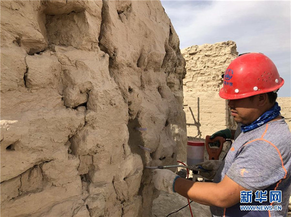 這是搶險加固中的樓蘭古城三間房遺址(7月27日攝,手機(jī)照片)。新華社發(fā)(中鐵西北科學(xué)研究院有限公司提供)