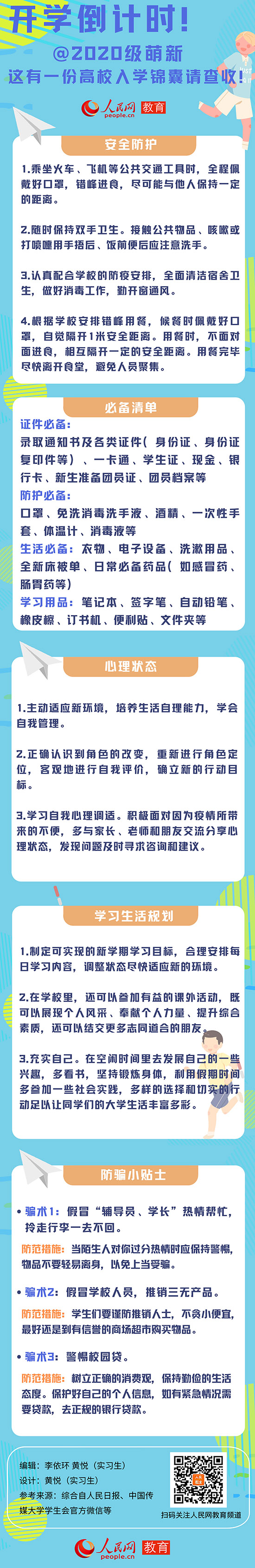 當(dāng)前,全國(guó)多地高校已經(jīng)陸續(xù)公布秋季開(kāi)學(xué)時(shí)間,大學(xué)校園即將迎來(lái)“萌新”報(bào)到。人民網(wǎng)教育頻道特別梳理了一份入學(xué)錦囊,請(qǐng)即將步入新階段的學(xué)子們查收,元?dú)鉂M(mǎn)滿(mǎn)開(kāi)啟大學(xué)校園生活。(李依環(huán) 實(shí)習(xí)生黃悅)